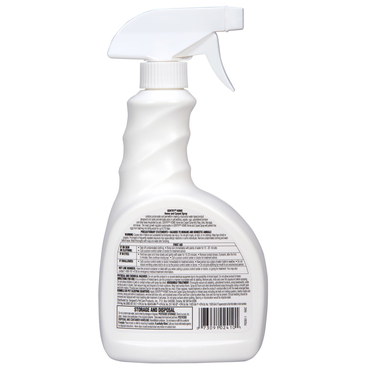Wash with soap and water after handling and before eating drinking chewing gum using tobacco or using the toilet. SENTRY HOME Home and Carpet Spray eliminates odors in pet bedding carpet rugs upholstered furniture and other areas frequented by pets. Kills flea ticks mosquitoes and many others.